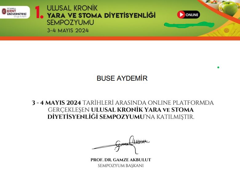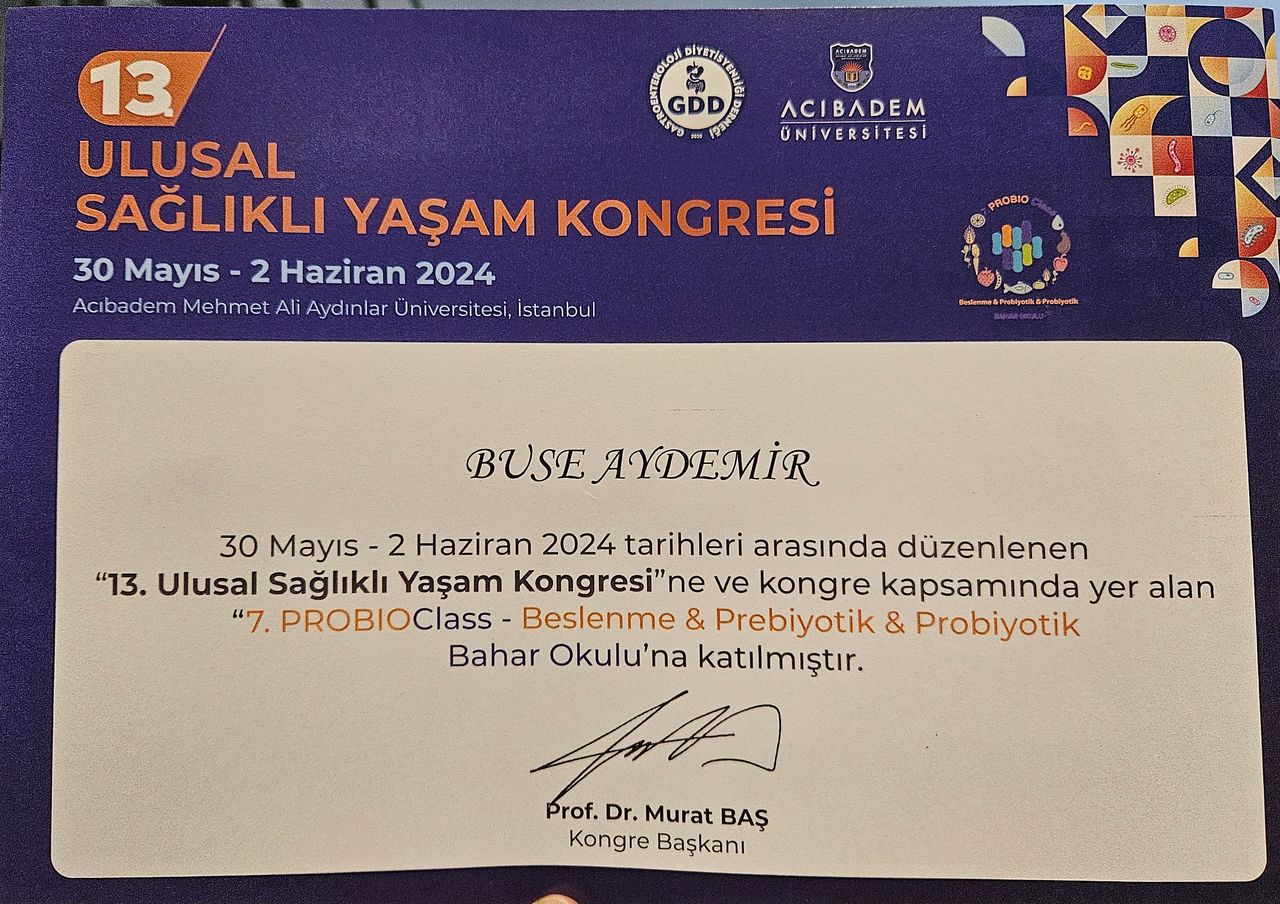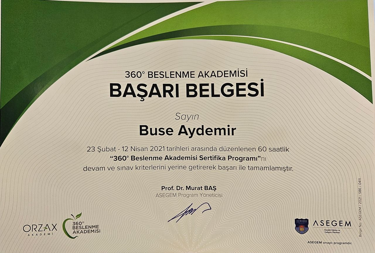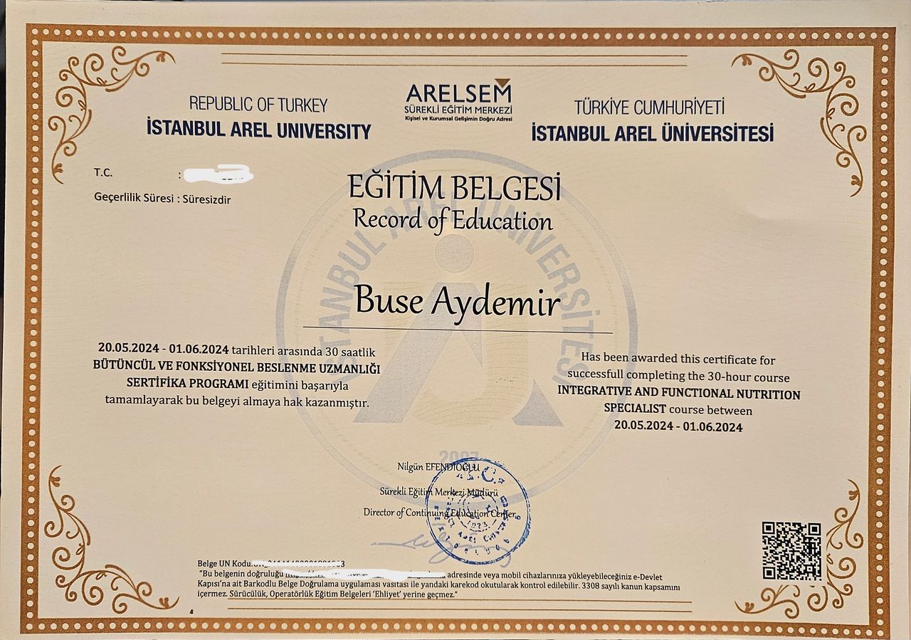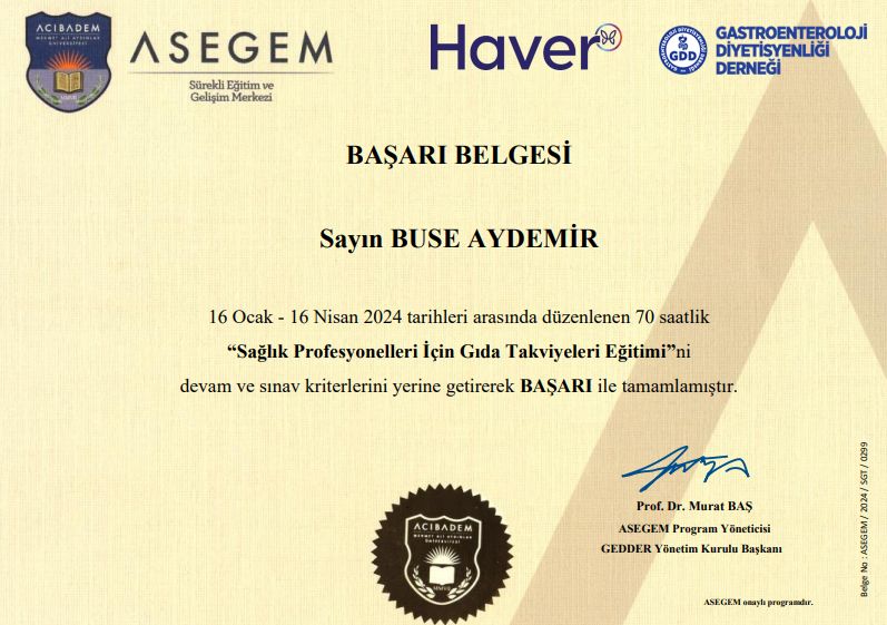 Merhaba, ben Diyetisyen Buse Aydemir. Florence Nightingale Hastenelerine ait olan Demiroğlu Bilim Üniversitesi'nden başarı ile 2023 yılında mezun oldum. Öğrencilik hayatımda zorunlu ve gönüllü olarak birçok prestijli ve idealist kurumda staj yaptım. Bunların başında Moodist Psikiyatri Hastanesi, İstanbul Florence Nightingale Hastanesi ve Gürdal Ören Obezite Cerrahisi yer almaktadır. Mezuniyet projesi kapsamında 101 öğrenci ile yaptığım kesitsel saha çalışmam, Gümüşhane Üniveristesi Sağlık Bilimleri Dergisi 2024 Mart sayısında yayımlanmıştır. 2024 Haziran ayında Uluslararası Bütüncül ve Fonksiyonel Beslenme Uzmanlığı eğitimini başarılı ile bitirerek Bütüncül ve Fonksiyonel Beslenme Uzmanı sertifikamı aldım. Danışanlarıma bütüncül ilkeler ile (kan tahlilleri, sahip oldukları hastalıklar) özenle hazırladığım tıbbi beslenme planları ile yardımcı olmaktayım. Öğrenciyken ve mezun olduktan sonra birçok kaliteli ve bilimsel eğitim programına katılarak, mesleki anlamda güncel gelişmeleri takip ederek danışanlarıma daha fazla yardımcı olmaktayım.